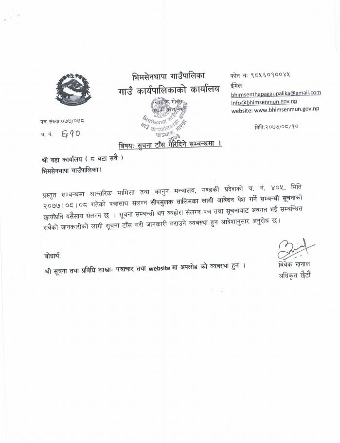 जानकारी सम्बन्धमा श्री वडा कार्यालय सबै भिमसेनथापा गाउँपालिका