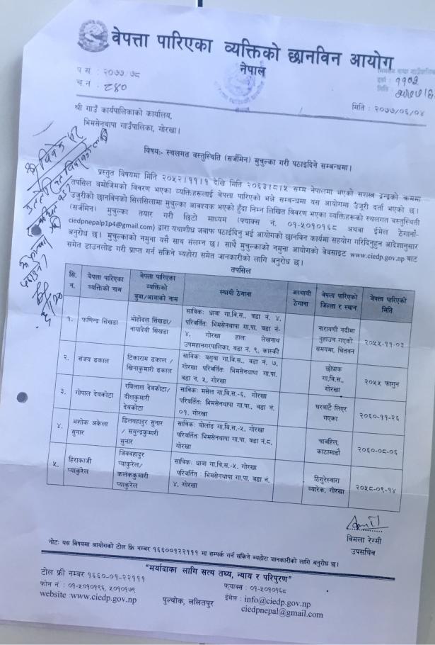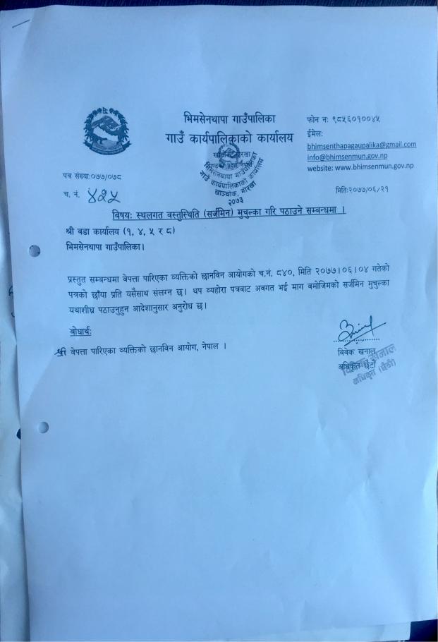 » स्थलगत वस्तुस्थिति (सर्जमिन) मुचुल्का गरि पठाउने सम्बन्धमा (उल्लेखित वडा कार्यालयहरु )