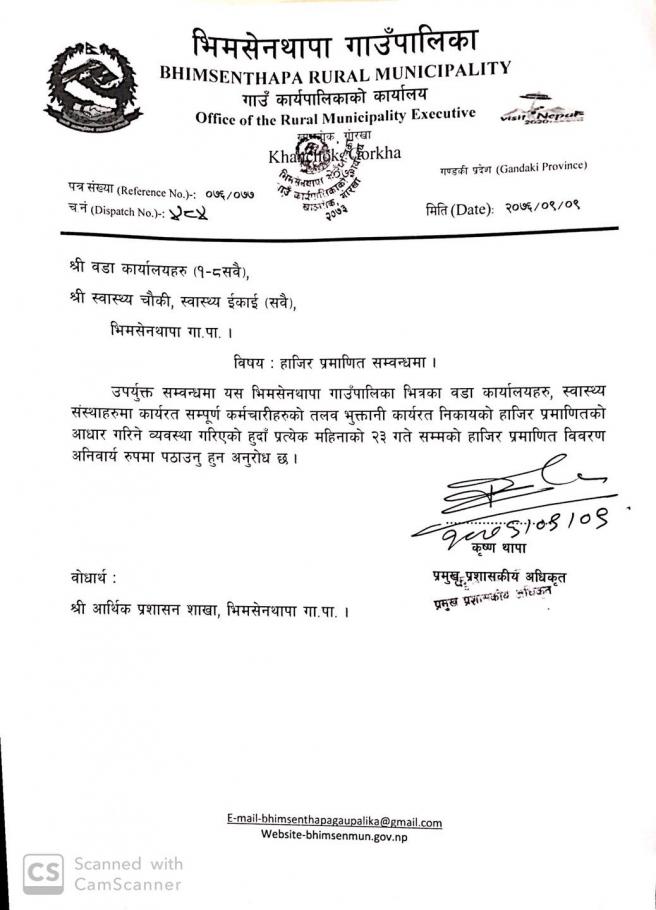 जानकारी सम्बन्धमा श्री वडा कार्यालय सबै भिमसेनथापा गाउँपालिका