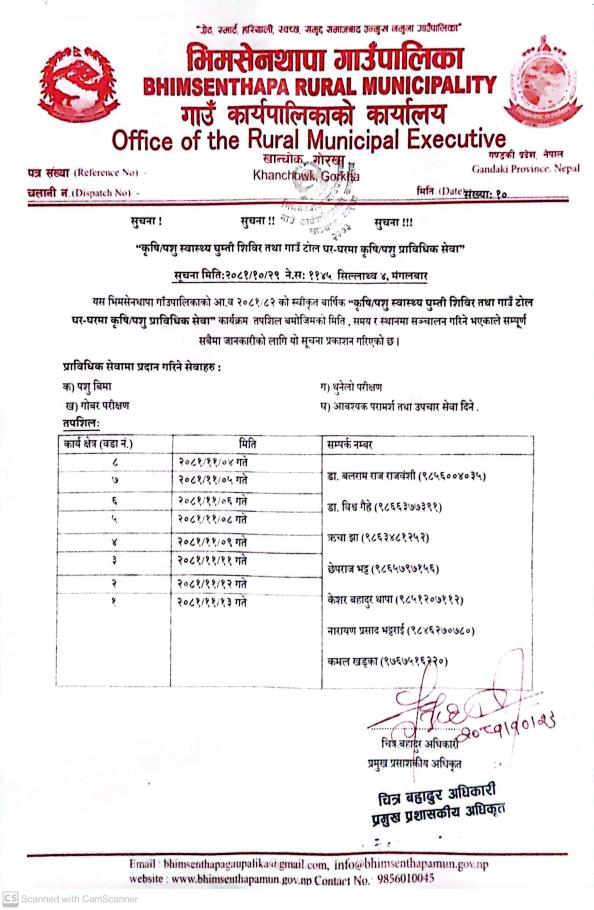 जानकारी सम्बन्धमा श्री वडा कार्यालय सबै भिमसेनथापा गाउँपालिका