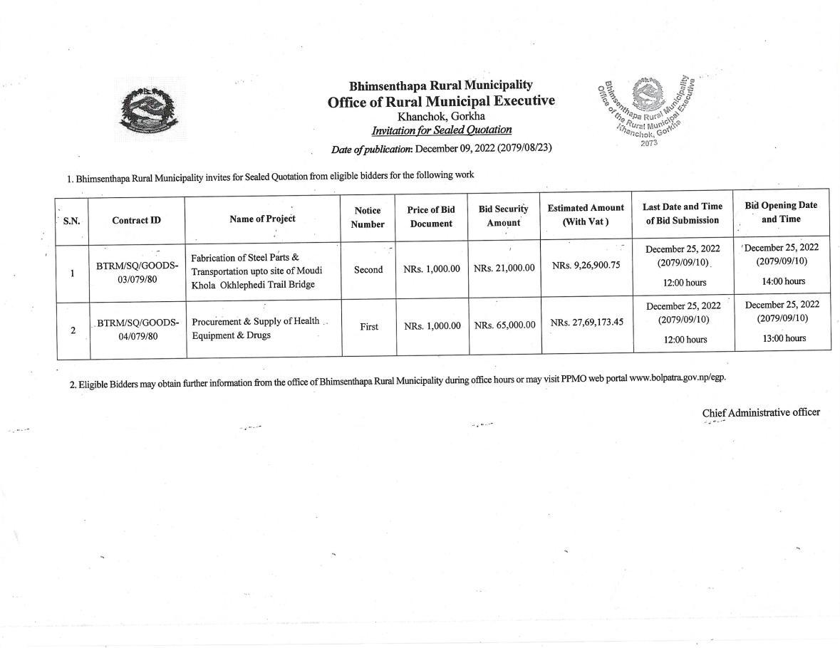 » Bhimsenthapa Rural Municipality invites for sealed quotation from eligible bidders.
