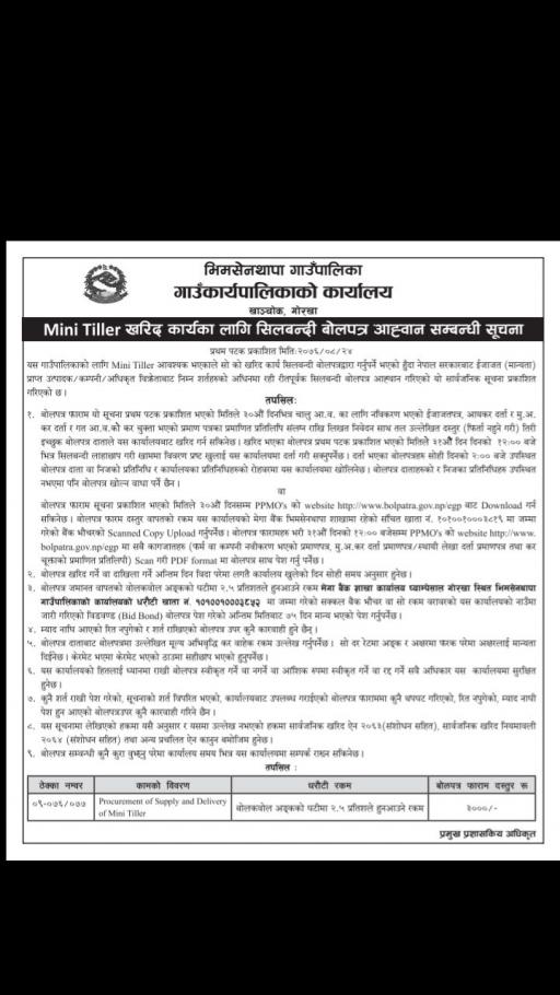 » Mini Tiller खरिदको कार्यका लागि सिलबन्दी बोलपत्र आहवान सम्बन्धि सुचना ।