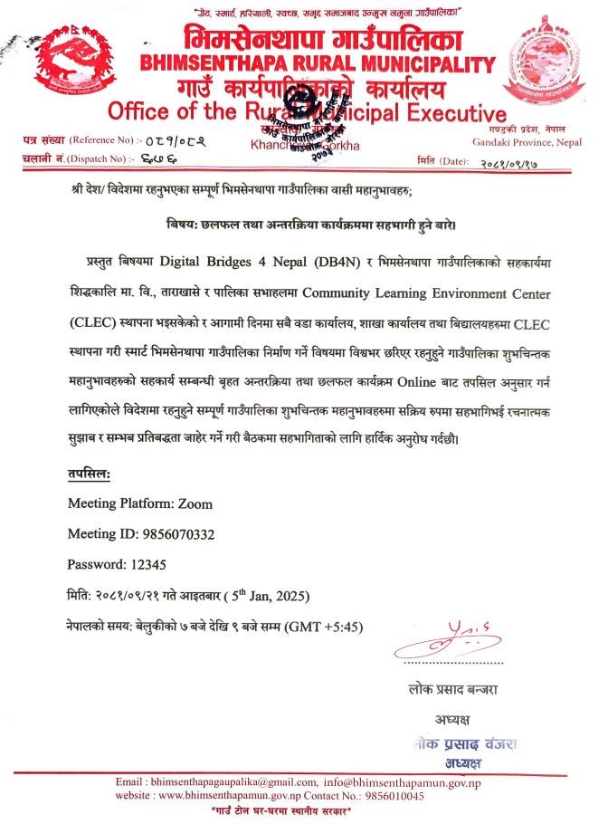 » Zoom मार्फत हुने छलफल कार्यक्रममा सहभागिताका लागि अनुरोध ।