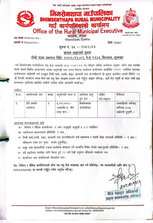 डेरी प्रबर्धन कार्यक्रमका लागि प्रस्ताव आव्हान सम्बन्धी सूचना ।
