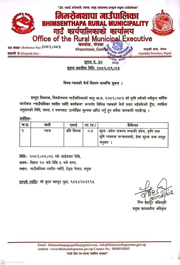 प्याजको बेर्ना बितरण सम्बन्धी सूचना ।