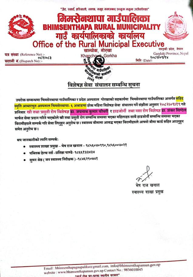बिशेषज्ञ डाक्टरहरु द्वारा स्वास्थ्य जाँच तथा उपचारहुने सम्बन्धी सूचना ।