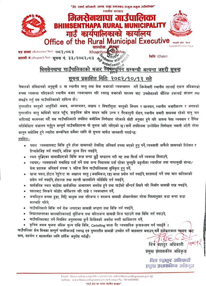 भिमसेनथापा गाउँपालिका क्षेत्रभित्रका व्यवसायीहरुको लागि सार्बजनिक सुचना ।।