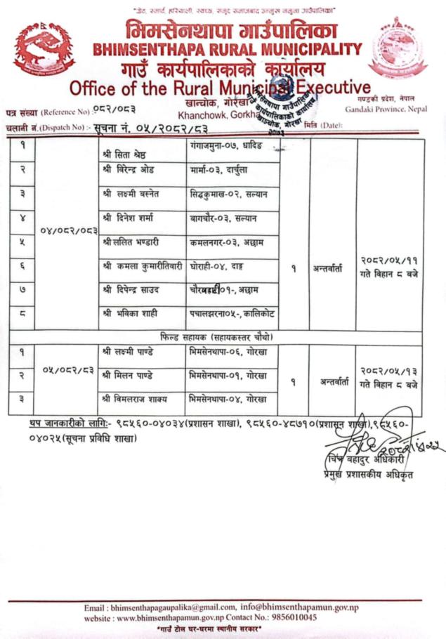 एम.आई.एस.अपरेटर र फिल्ड सहायक पदको सीप परिक्षण तथा अन्तर्वार्ता सम्बन्धमा ।