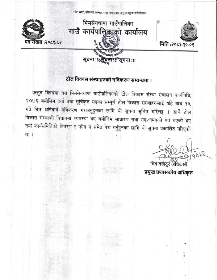 भिमसेनथापा गाउँपालिका क्षेत्रभित्रका व्यवसायीहरुको लागि सार्बजनिक सुचना ।।