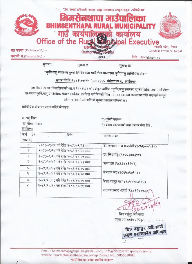 पशु स्वास्थ्य घुम्ती शिबिर तथा गाउँ टोल घर-घरमा पशु प्राबिधिक सेवा संचालनहुने सम्बन्धी सूचना ।