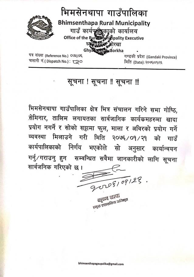 गाउँसभामा उपस्थित भै दिनुहुन।यस भिमसेनथापा गाउँपालिकाको चौथो गाउँसभा यही मिति २०७६।०१।२२ गते बिहान ८:०० बजे शिक्षा शाखा घ्याम्पेसालको सभाहलमा शुरु हुने भएकोले सम्पूर्ण गाउँसभा सदस्यहरुलाई जानकारी गरिसकेको छ। कुनै कारणबस सूचना प्राप्त नभएको भएमा यसै सूचनालाइ आधार मानी उपस्थित हुन को लागि अनुरोध छ । |